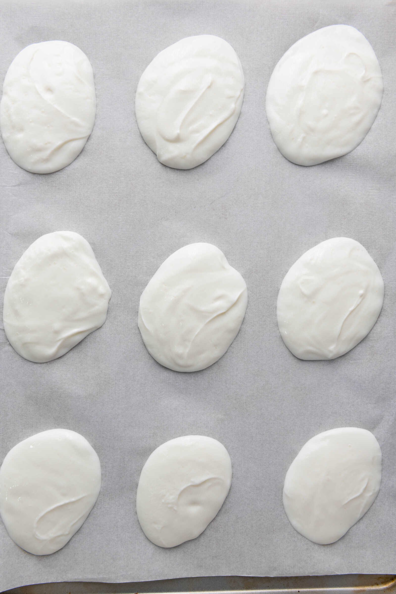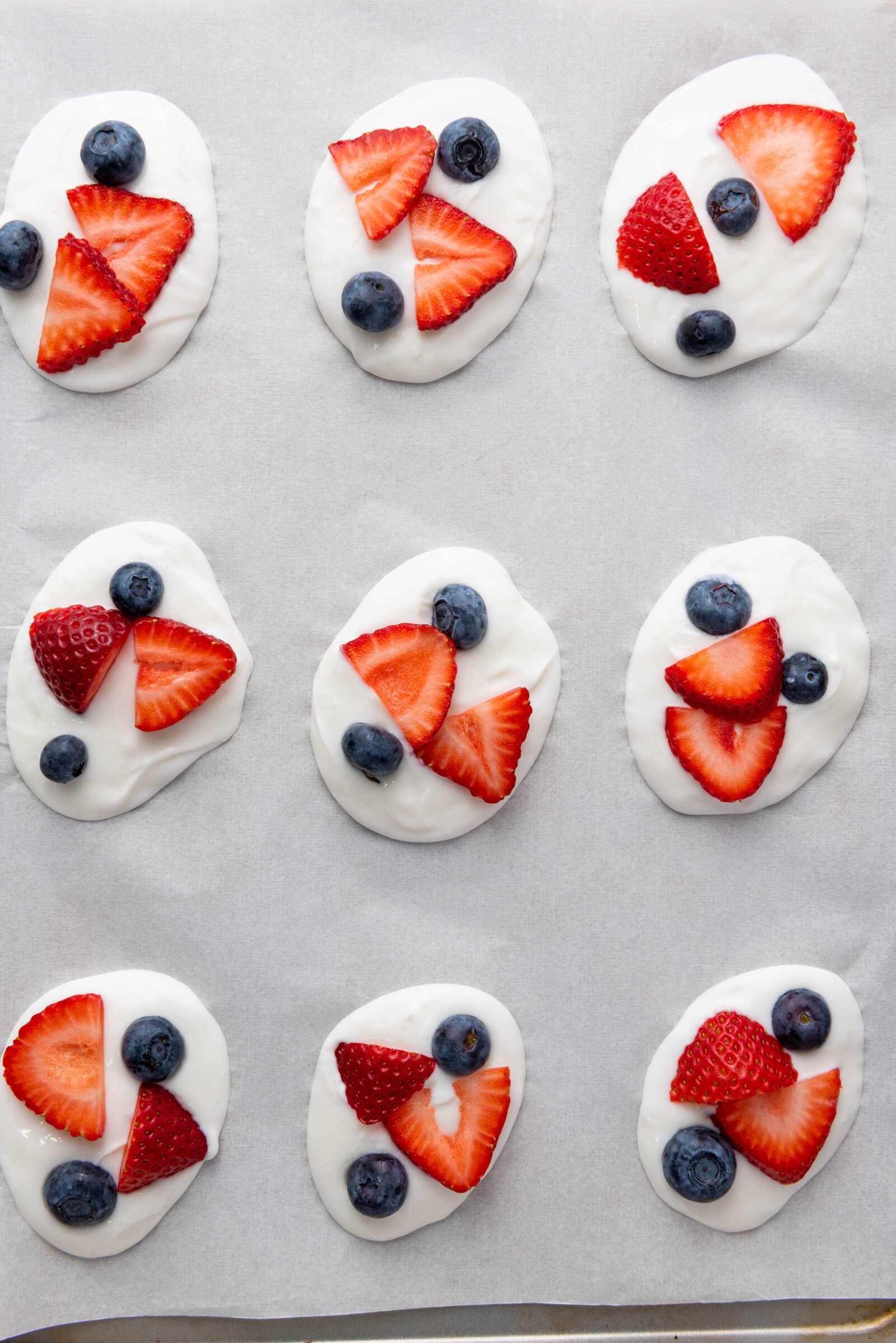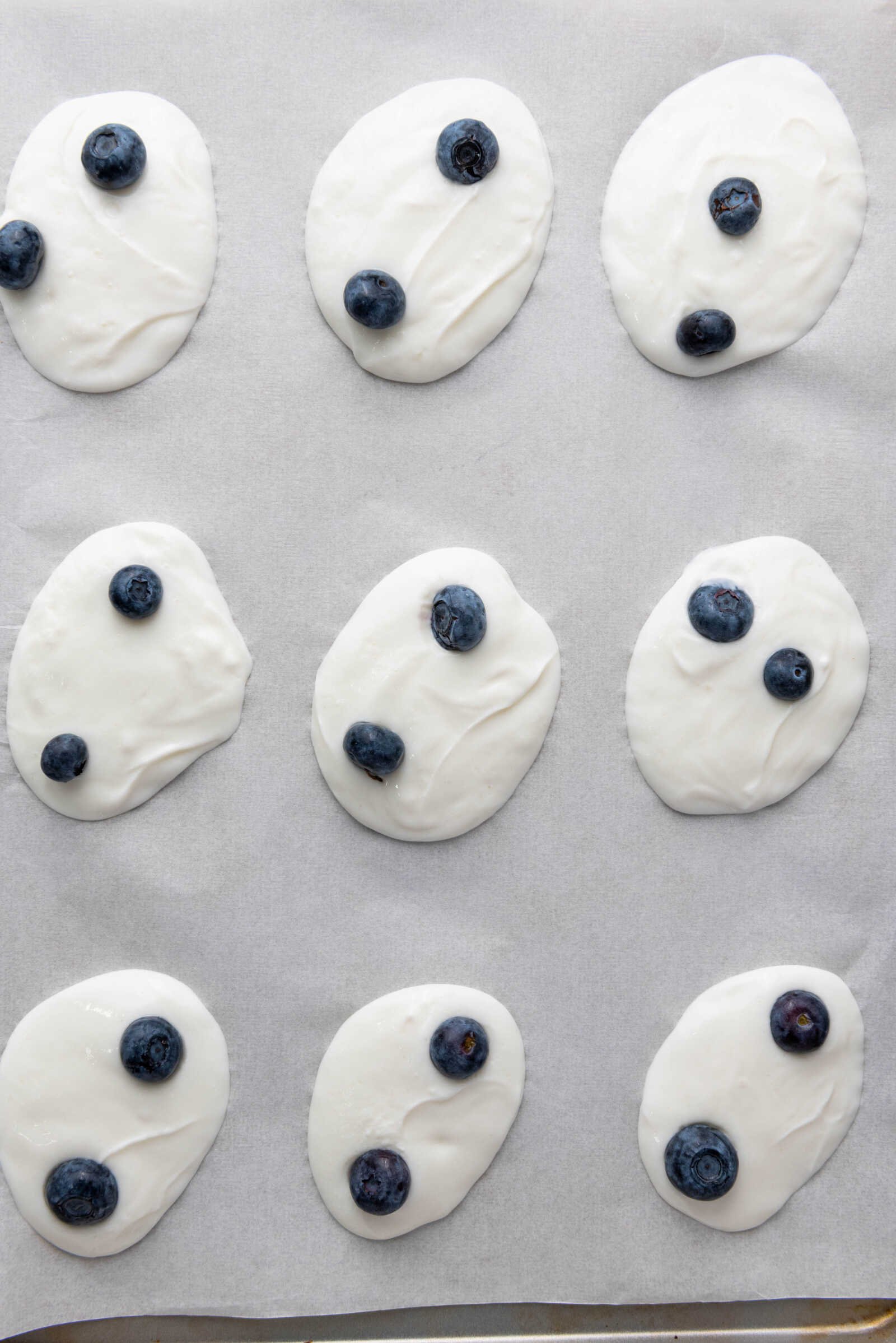 Using a spoon, drop 2–3 tablespoon dollops of yogurt onto the baking sheet. Leave space between each one so they don’t freeze together.